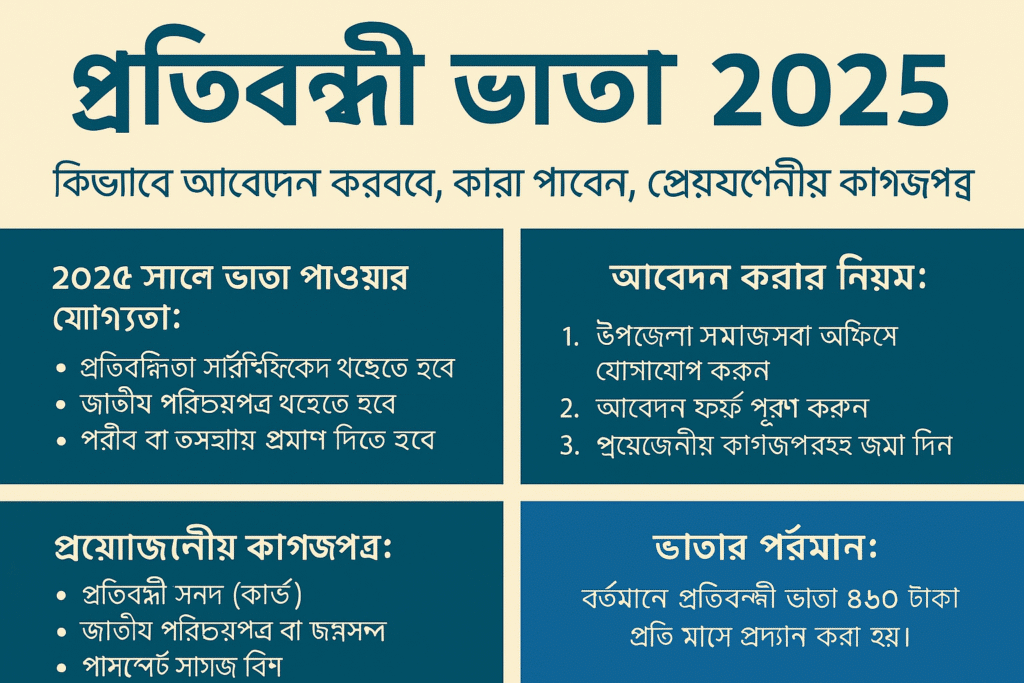 বাংলাদেশ সরকার প্রতিবন্ধী নাগরিকদের জন্য প্রতি মাসে আর্থিক সহায়তা প্রদান করে। ২০২৫ সালে এই ভাতা পেতে হলে নির্দিষ্ট নিয়ম অনুসরণ
